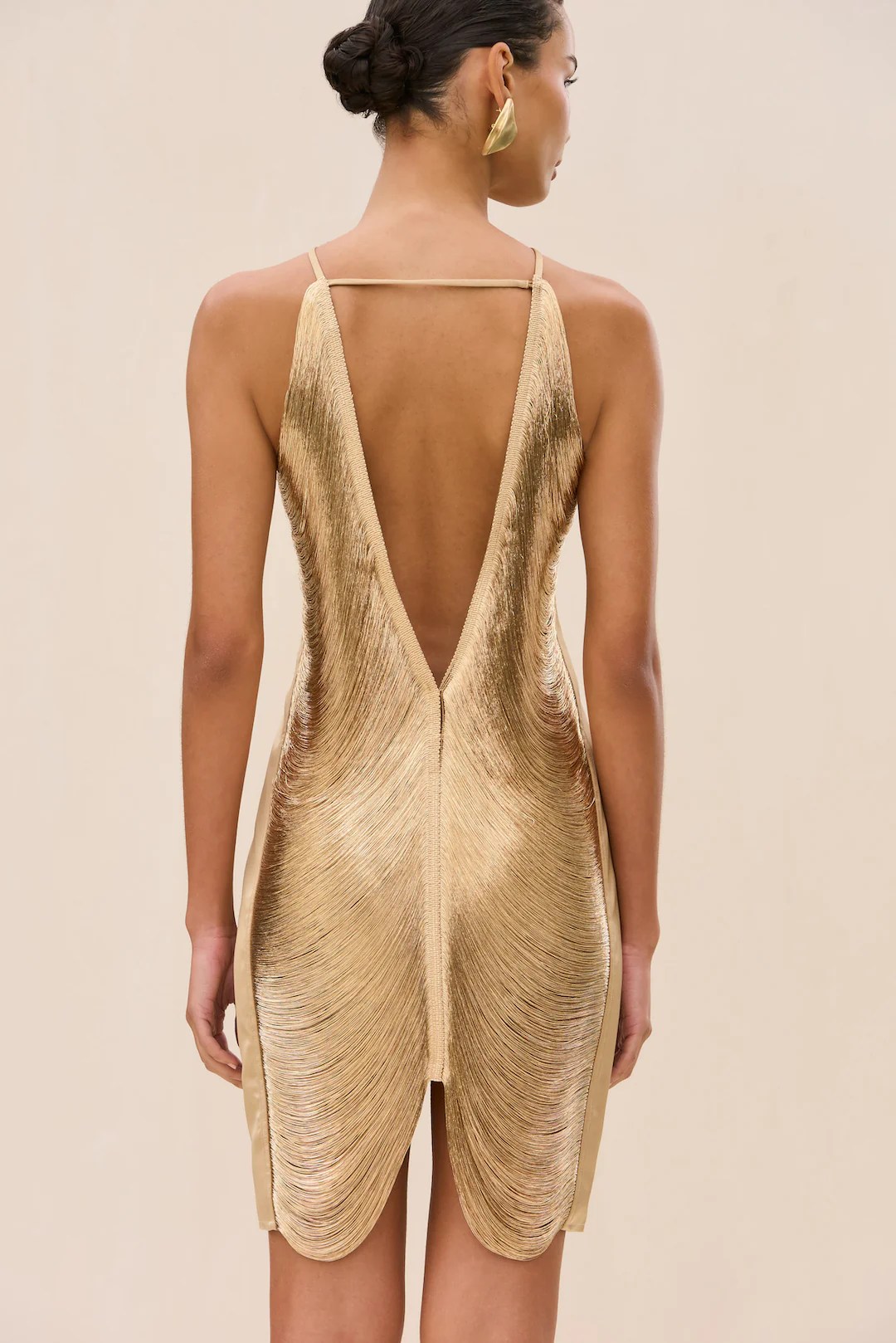 From its striking metallic mini dress fabric to its sculpted halter mini dress silhouette, every element is designed to create an unforgettable moment. Available in both gold cocktail dress and silver party dress variations, this fringe dress is a must-have for any fashion-forward wardrobe.