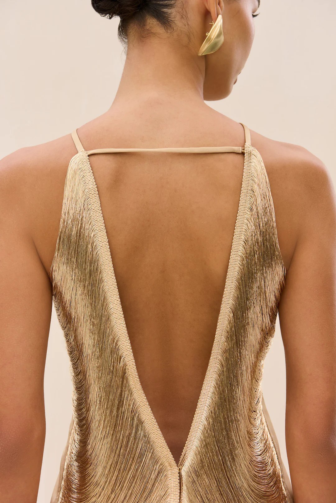 The Celeste Fringe Mini Dress is crafted from a high-shine metallic fringe fabric, meticulously arranged to create a hypnotic, fluid effect. Every strand of fringe sways gracefully, catching the light with each step. The halter mini dress silhouette features an ultra-sleek high-neck design, secured with delicate straps for an effortlessly modern finish. The open-back detail adds a bold touch, perfect for those who love statement-making fashion.